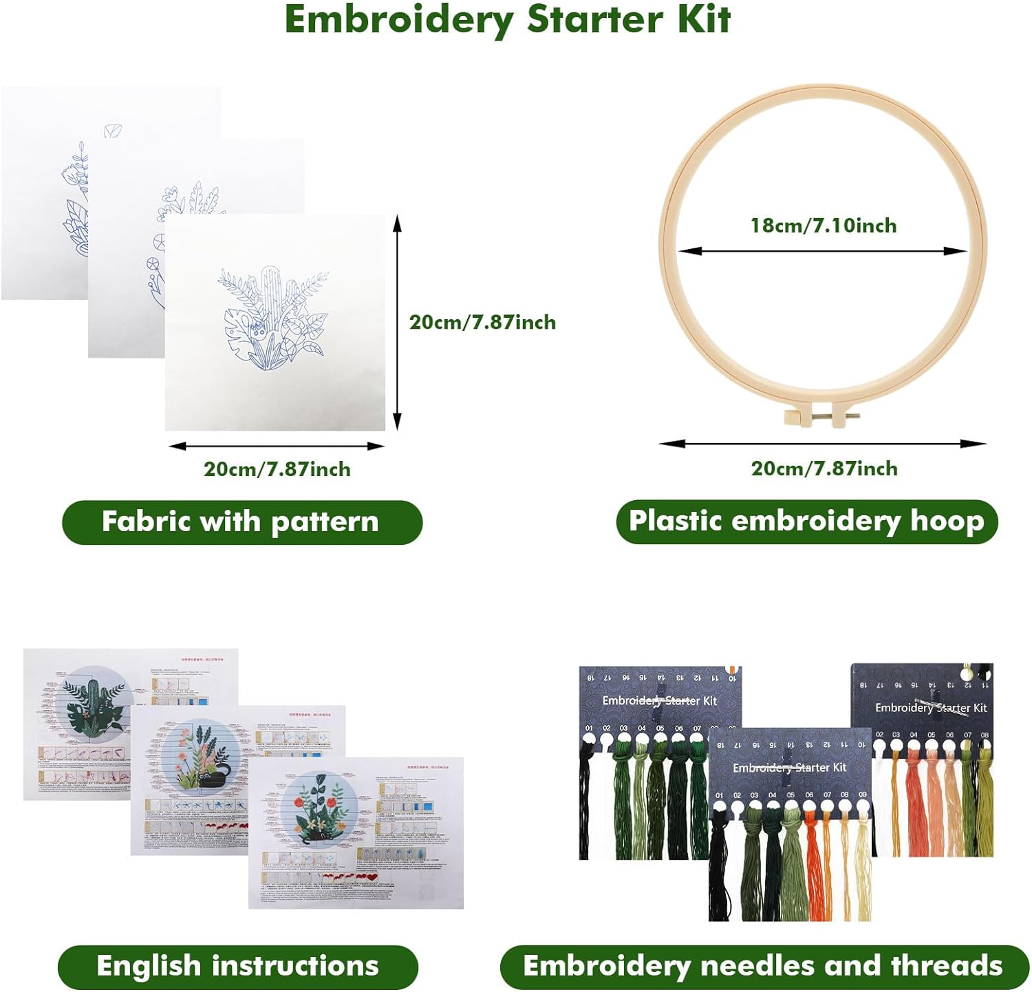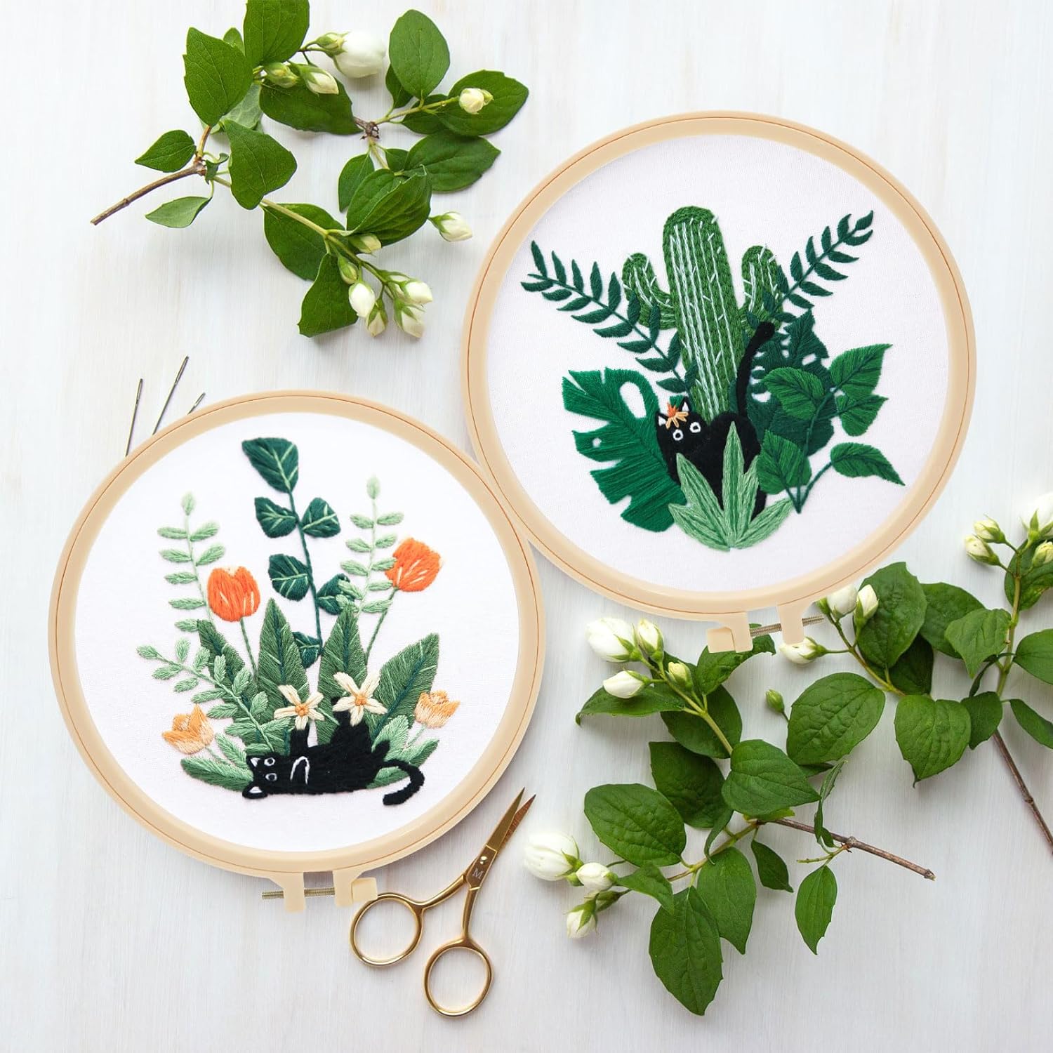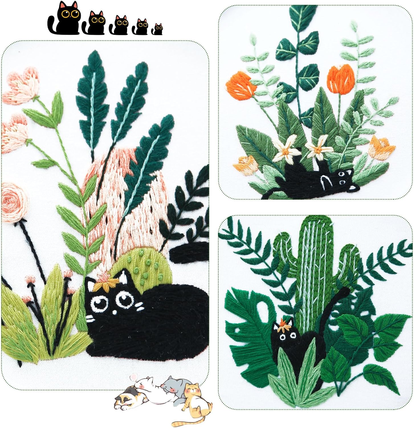 3 Pack Embroidery Kit for Beginners, Sewing Cross Stitch Starter Set Craft Stamped Cloth with Cute Cat Pattern Hoops Threads and Needles