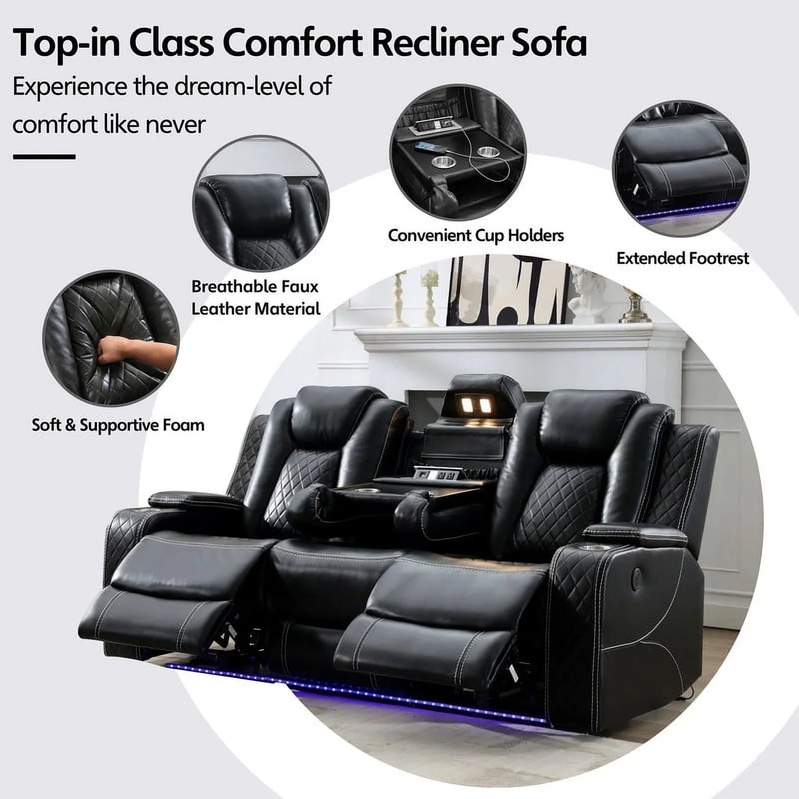 3-Seat Power Recliner Chair Sofa Set for Living Room,Black Faux Leather Electric Home Theater Seating Reclining Sofa Couch with Flipped Middle Backrest,LED Light,USB Port,Cup Holder,Hidden Arm Storage