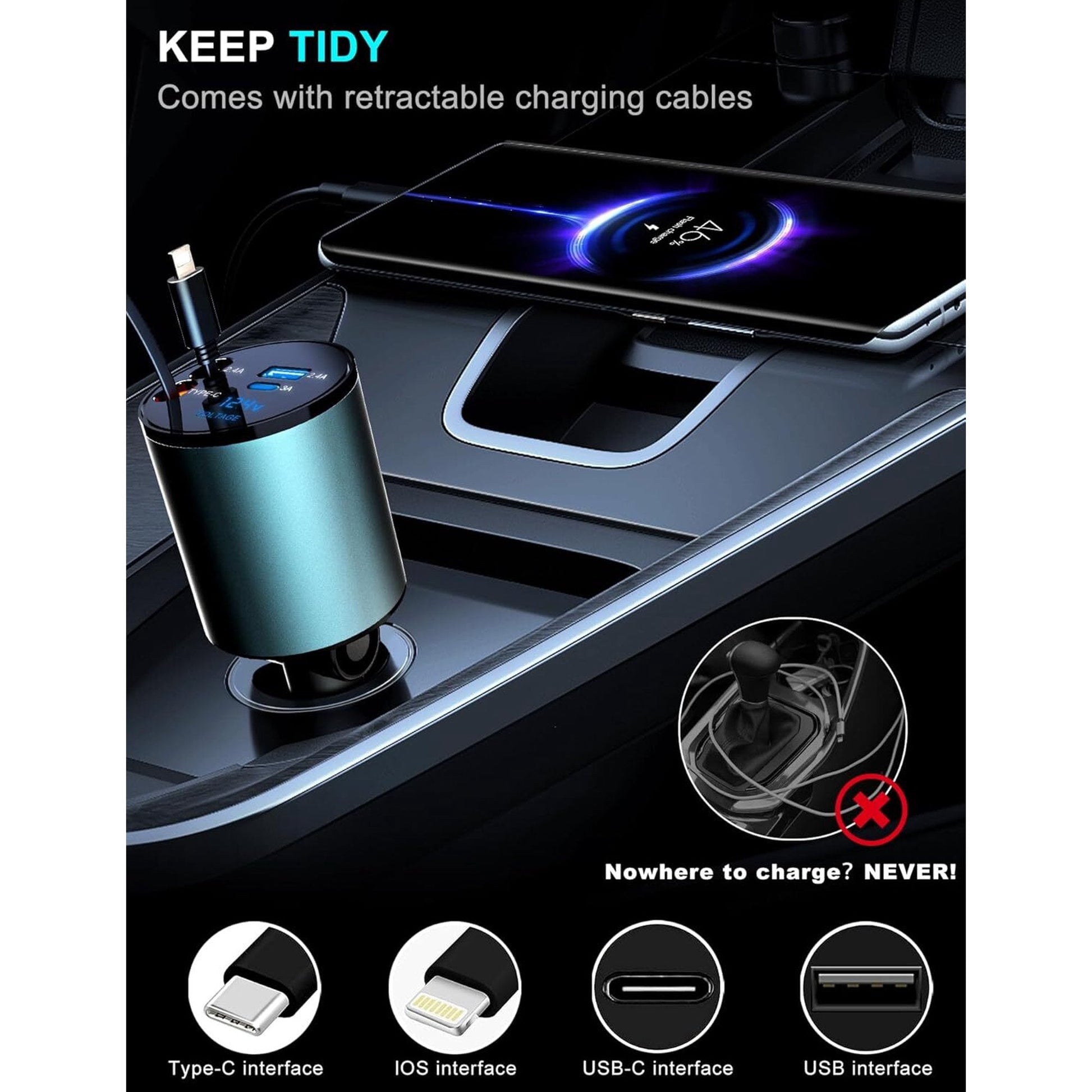 60W Multi-Port Car Fast Charger with Retractable Cable Car Cigarette Lighter Adapter, 4-in-1 Fast Charger for Smart Devices, Compatible with iPhone/Galaxy/Google/Tablet/Laptop, etc.