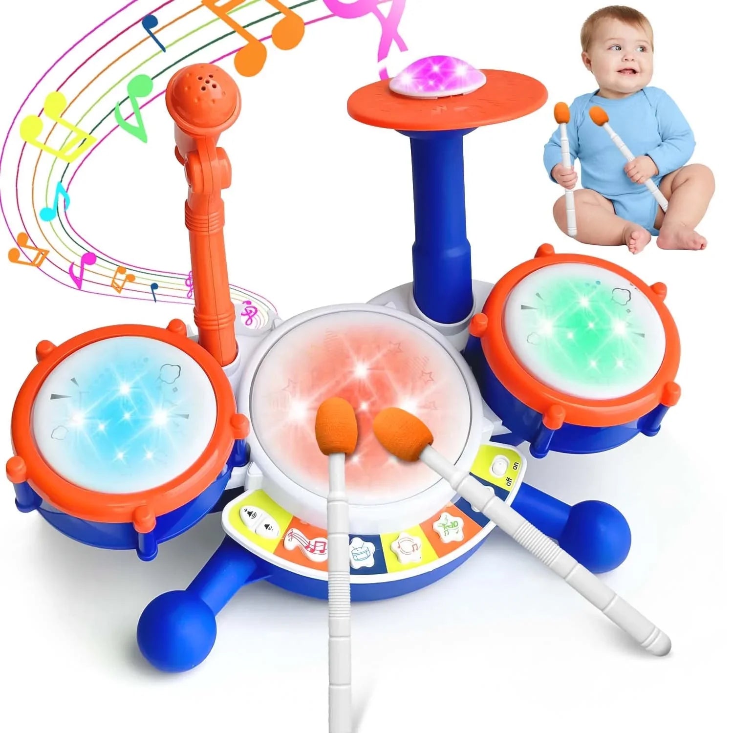 - Multifunctional Baby Musical Toys for Toddlers 1-3 - This baby drum set for toddlers 1-3 with 10 preset music tracks, 4 fun sound effects, 3 dynamic rhythms, plus drums, cymbals, 2 toddler drum sticks and microphone, the music volume is adjustable, toys for 1 year old boy protects baby's ears well, it's simple and easy to use, there is a stand for the drumsticks which is a plus so he doesn't lose them. This is the perfect baby musical toys for 1 year old childs to be the budding musician!