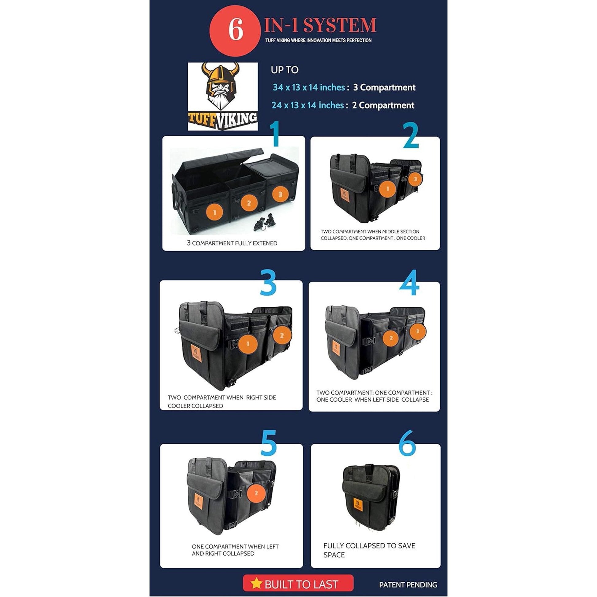 Convertible Large 3 Compartment SUV Trunk Organizer with Cover | Truck Bed Organizer | for Trucks, Cars, SUVs and Groceries with Tie Down Straps. (6 in 1 with Cover, Black)