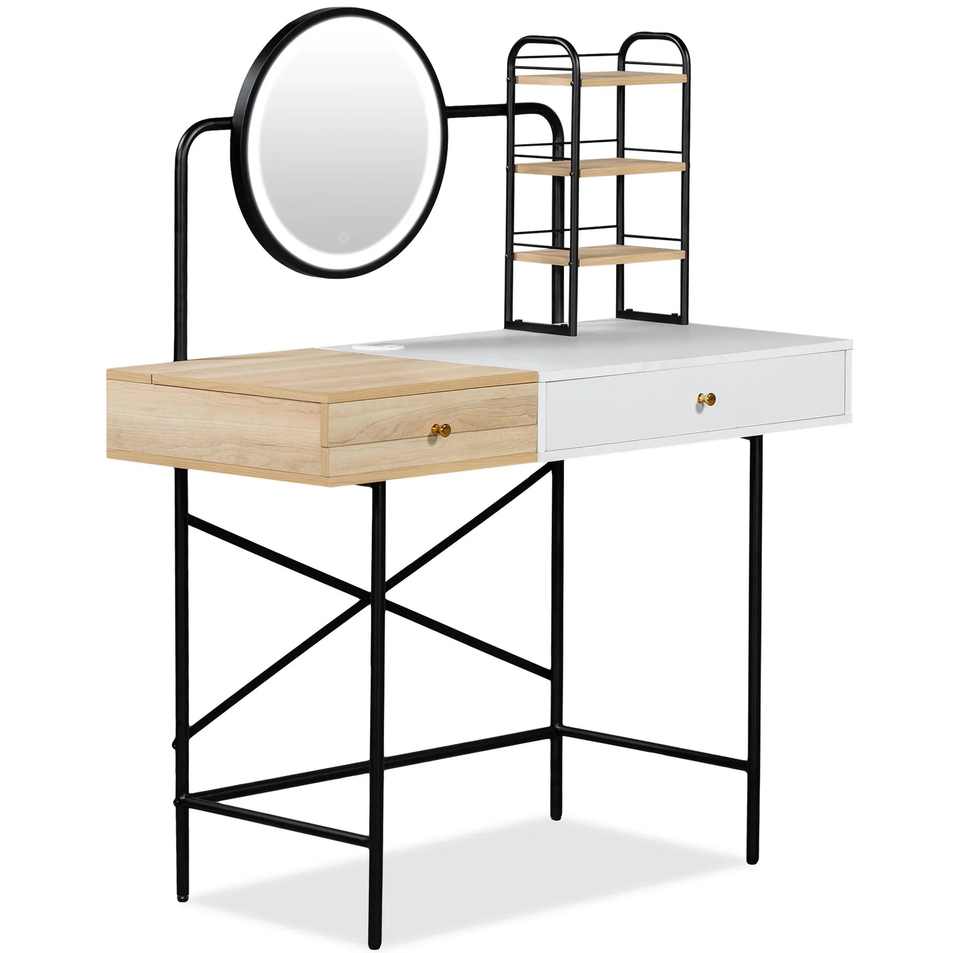 This Dressing Table is our latest design. The vanity desk features an illuminated mirror with bright, but not blinding, touch-switch LED lights, this vanity is available in 3 color modes: warm yellow, warm white, and cool white for various indoor lighting and environments to optimize your makeup look. At the same time, this dressing table has drawers and shelves, which can be used as a workbench and a desk to provide you with different functions.