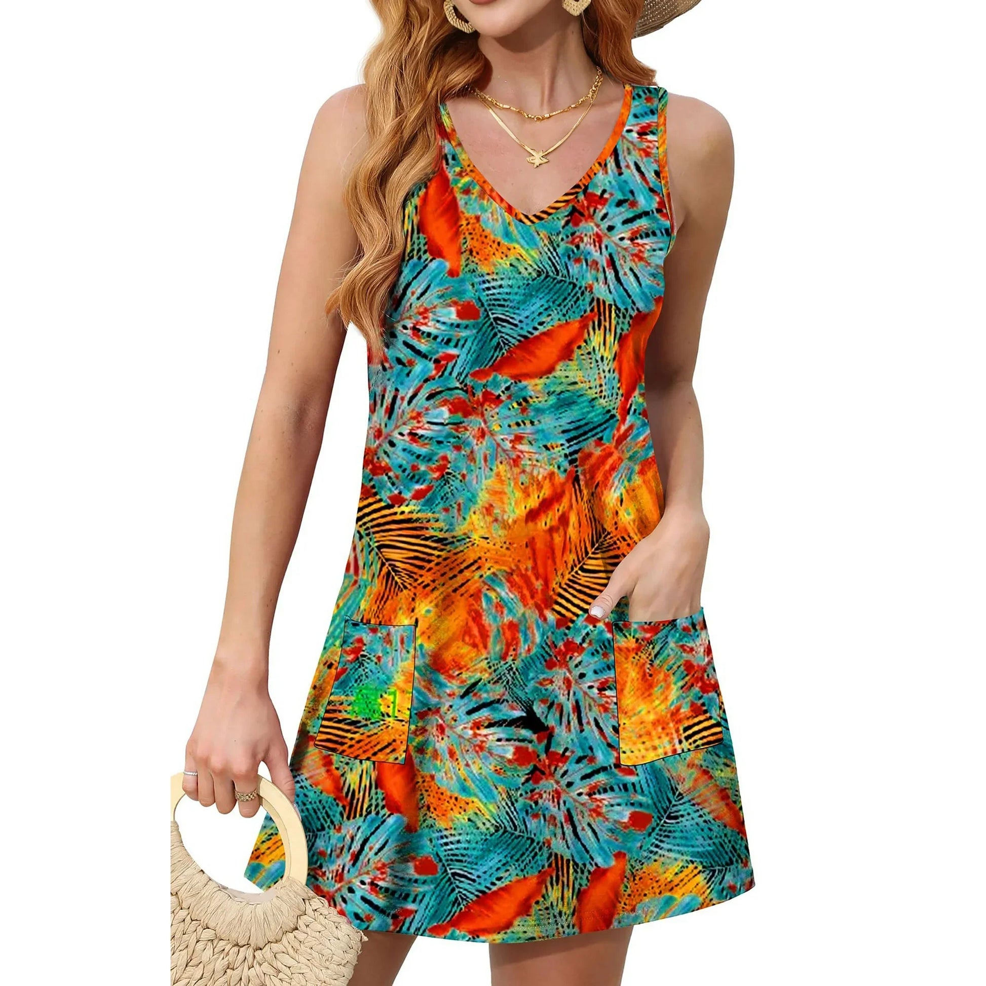Sleeveless dresses for women is the perfect addition to your summer wardrobe, offering a relaxed yet stylish look. Designed with a flattering v neck and sleeveless cut, womens dresses provides ultimate comfort and breathability for those sunny days. Womens casual summer dress with two pockets, swing hem, which will flow with the wind blows and each step you take. Tank dresses for women can be worn in various ways, with a belt, the loose fit instantly turns into a neat and slim skirt. In the cool spring and autumn, boho dresses with pockets can be matched with coats in variety of styles. Womens mini dress with colourful element and style, tunic waist, soft tank, vacation beach sundress, holiday boho dresses, beach cover ups, vacation outfits, simple classic but never go out of style,wear it and you will reap charm and beauty.
