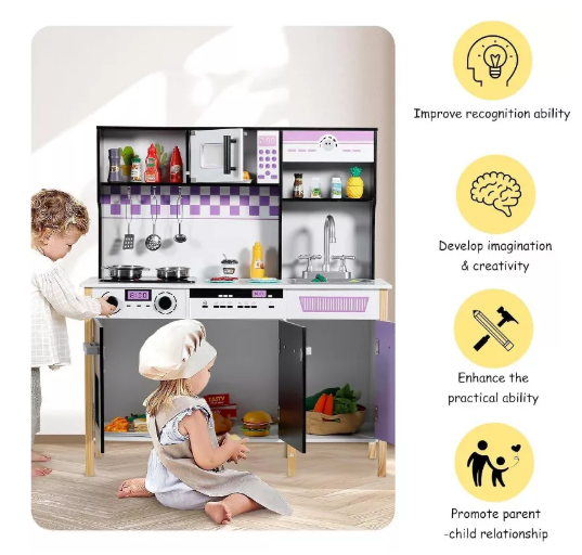 Multifunctional Play Kitchen:There are all kinds of pretend equipment, such as microwave, oven, stove top, sink, etc. Fun kitchen toys can help children improve their recognition ability and imagination; It also promotes parent-child relationship