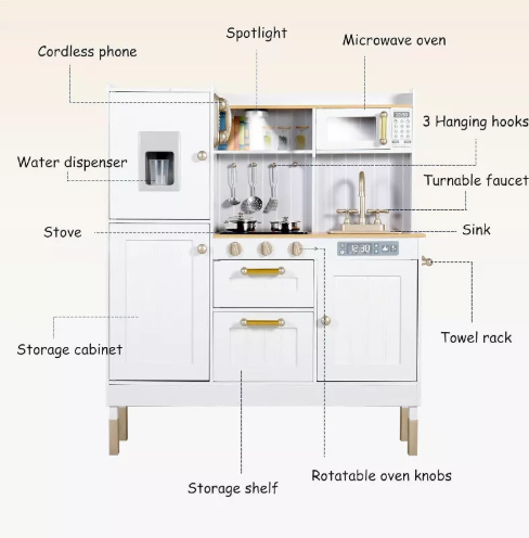 Multifunctional Play Kitchen: There are all kinds of pretend equipment, such as Ice maker, microwave, oven, stove top, sink, wireless phone, etc. Fun kitchen toys can help children improve their recognition ability and imagination