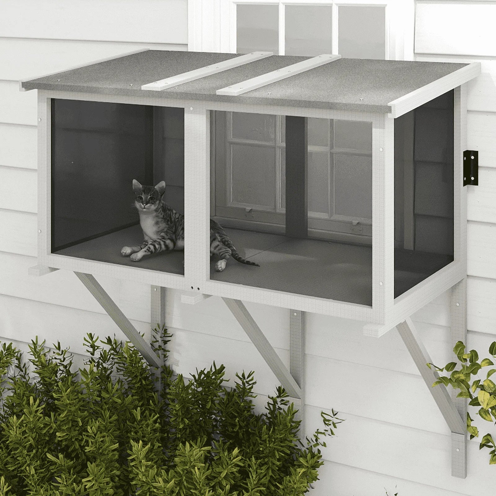 - 【ALL-WEATHER PROTECTION】Built for year-round use, this window catio features a waterproof roof to shield cats from rain and harsh sunlight. Unlike suction-based perches, this catio for sliding glass doors and standard windows is securely mounted, ensuring long-term stability. Compatible with windows up to 37.75” wide, it installs easily on wood or brick walls.