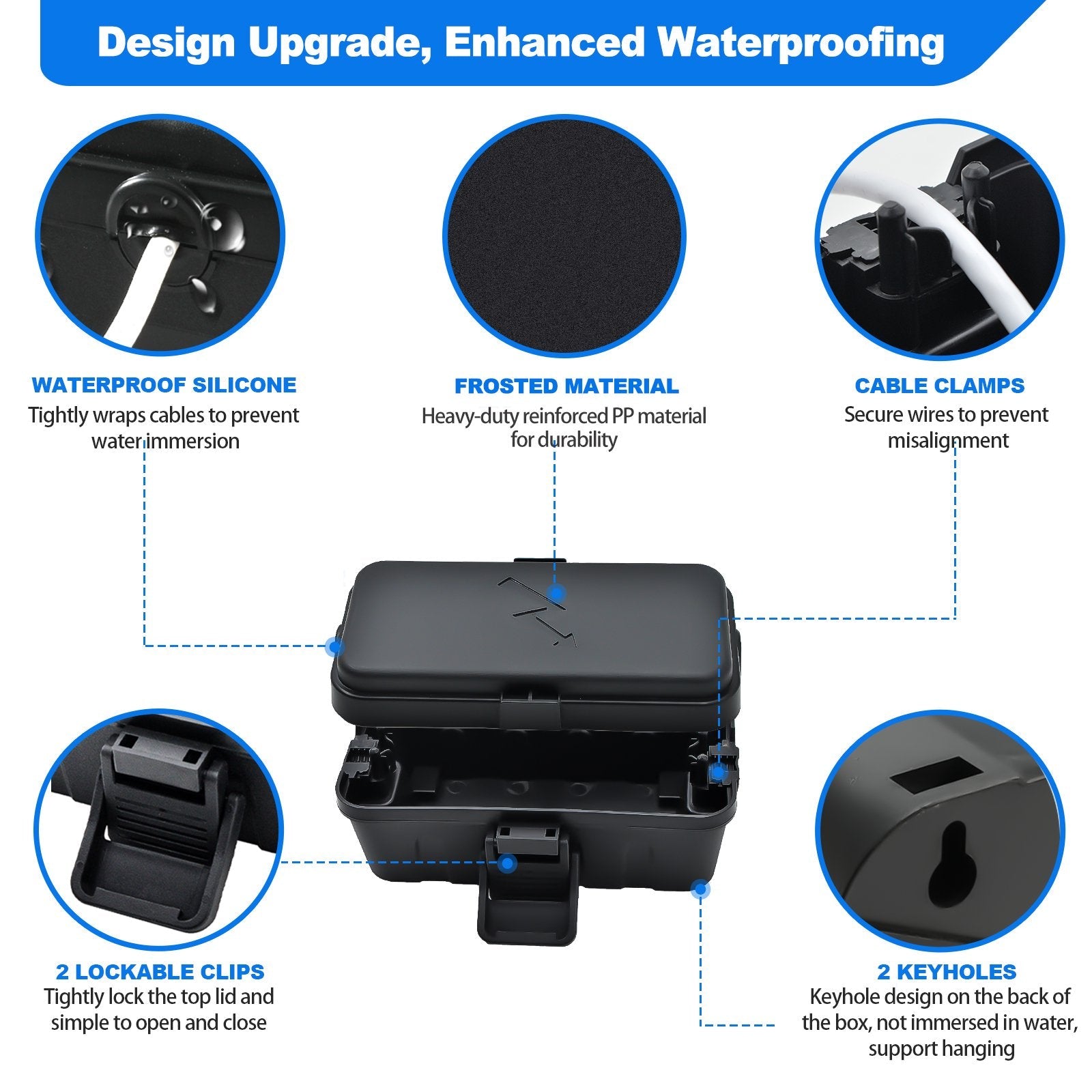 - Easy to use, place the connection into the safety seal enclosure and clip the cord with the clamps. Simple to hang the box on any walls with the dual mounting holes.