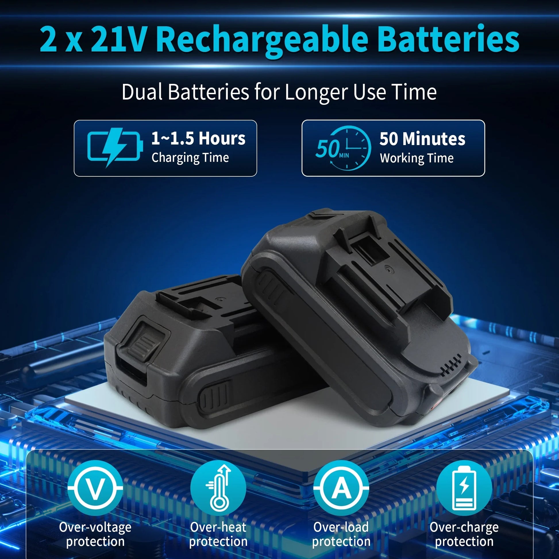 2 Batteries & 2 Chains: The 6 inch electric chainsaw is equipped with two 6" chains and two 21V 1300mAh rechargeable batteries, ensuring a continuous and reliable cutting experience. With the backup battery ready to replace the depleted one, you can seamlessly continue working 40-50 minutes on your cutting tasks without interruption. In addition, the charger included can help you get back to work quickly.