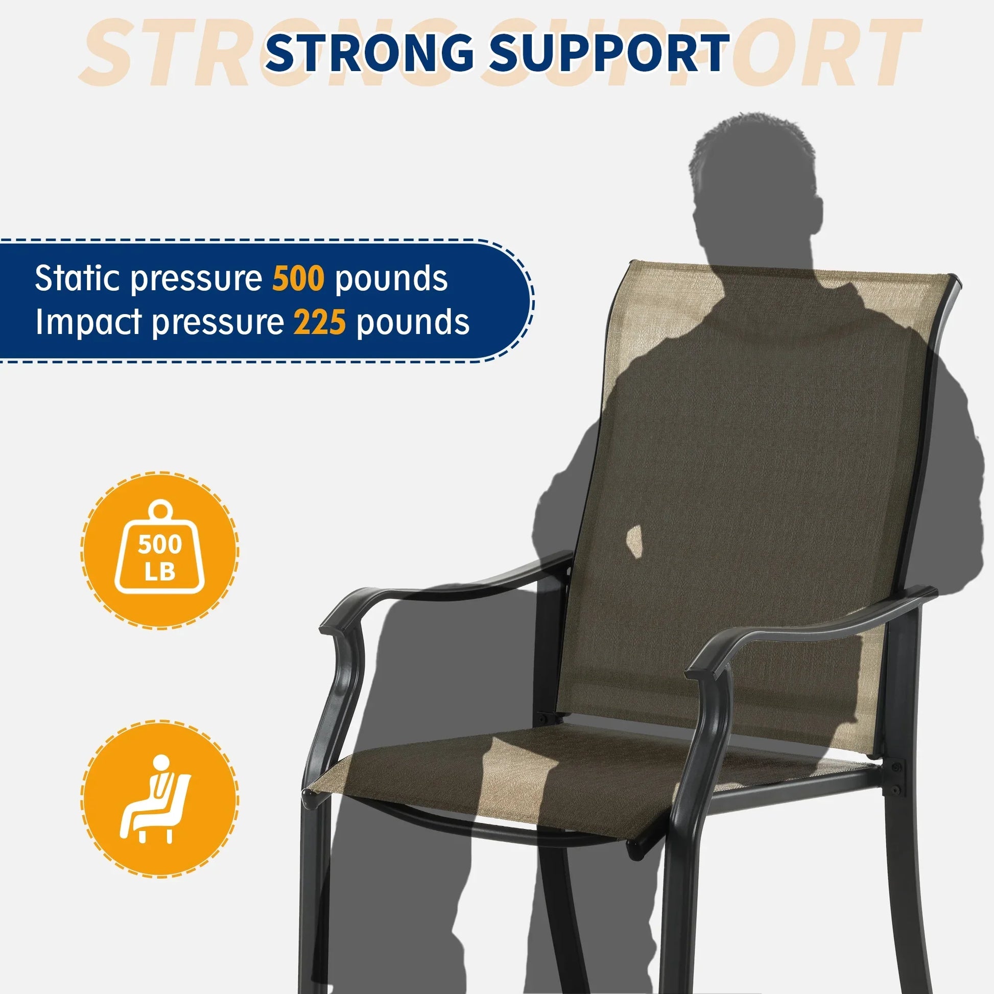 🌷【withstand 500 lbs】: Our patio chairs are made of thick galvanized steel pipes, with square pipes having a larger stress area; The thickened textilene fabric also provides good support; Both allow the chair to withstand a static pressure of 500 pounds and an impact pressure of 300 pounds
