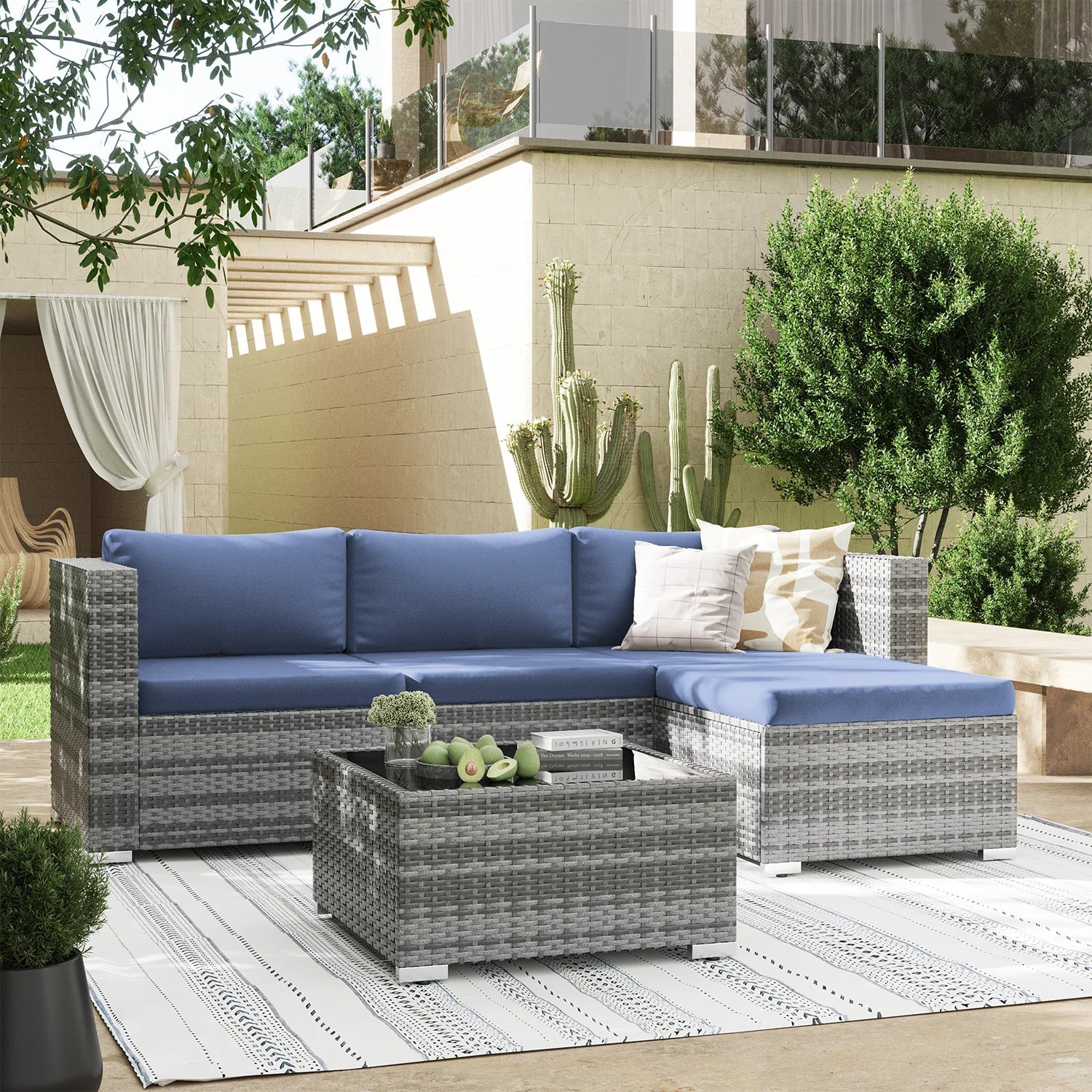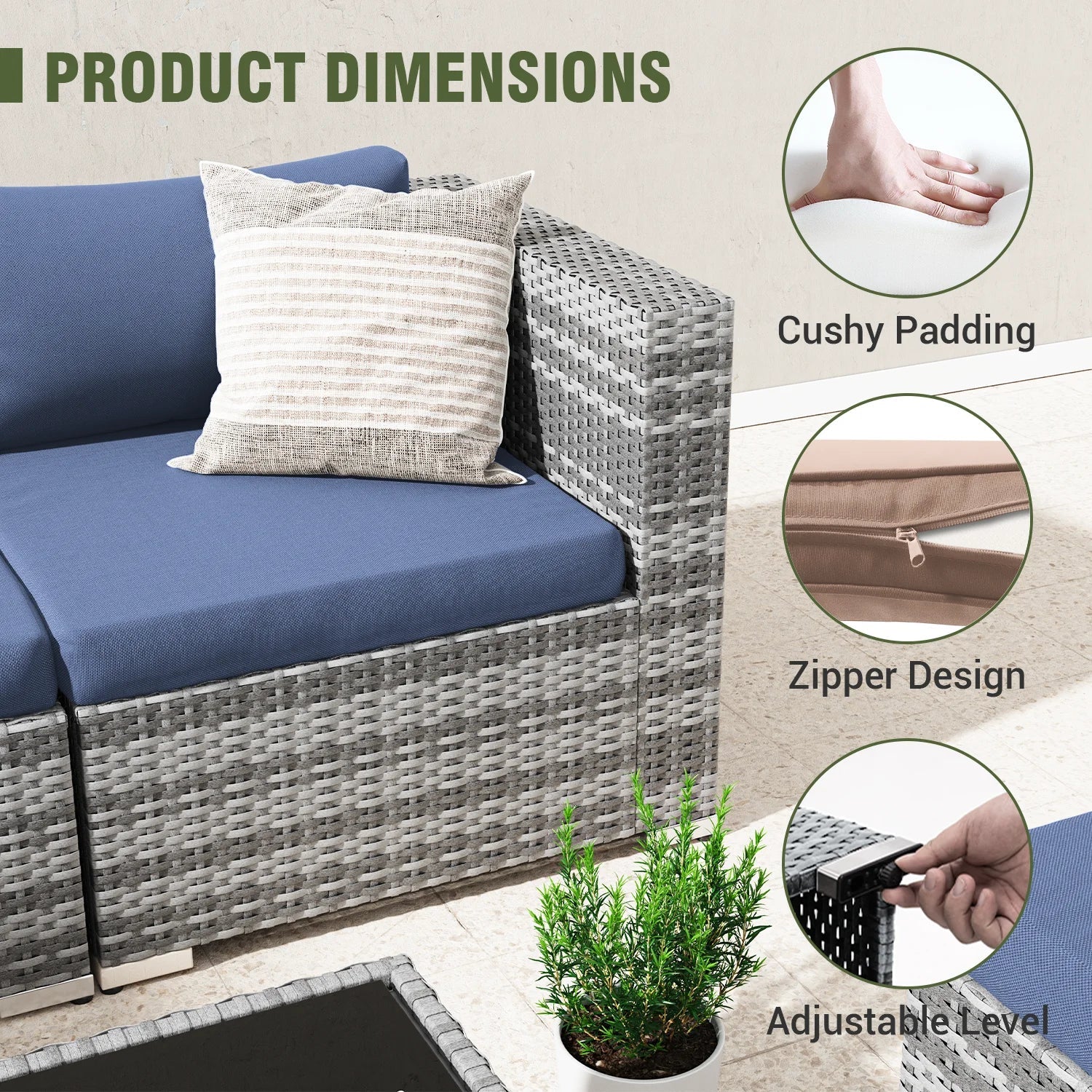 Specification:Rattan color: GrayCushion color:Gray/Khaki/BlueFame material:Rattancorner chair size:29.5 x 29.5 x 24.8 incharmless chair size:29.5 x 29.5 x 24.8 inchottman size:25.6 x 25.6 x 17 inchcoffee table size:25.6 x 25.6 x 13 inch